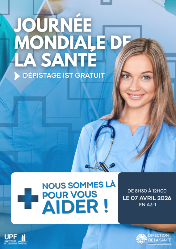 À l’occasion de la Journée Mondiale de la Santé, la Direction de la Santé, en partenariat avec l’Université de la Polynésie française et La Mouv’e, organise une journée de sensibilisation et de prévention le :